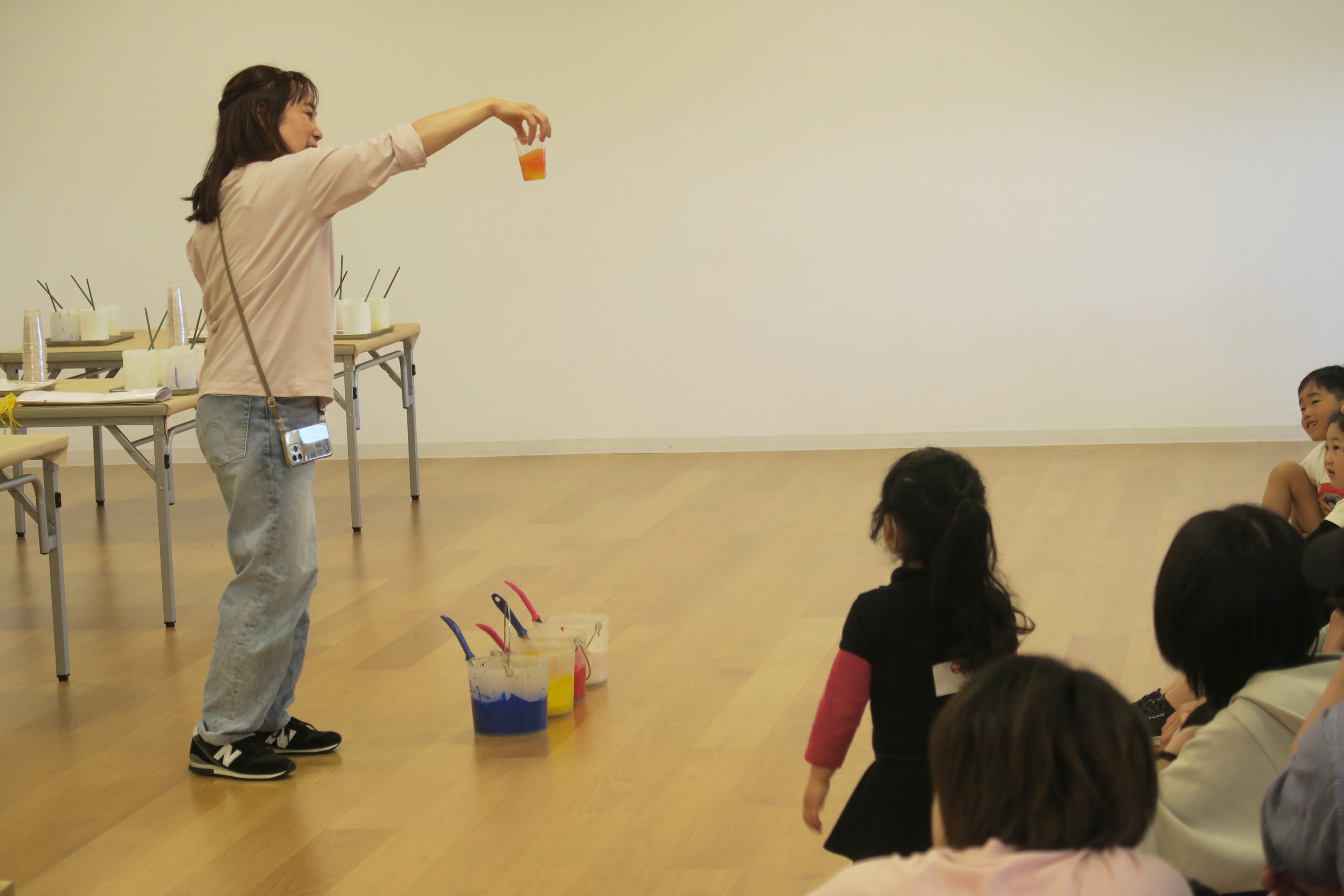 「“いっぱいジュース”は何がいっぱいなんだろう?」と山田先生が聞くと、「色がいっぱい!」と元気に答えてくれました。