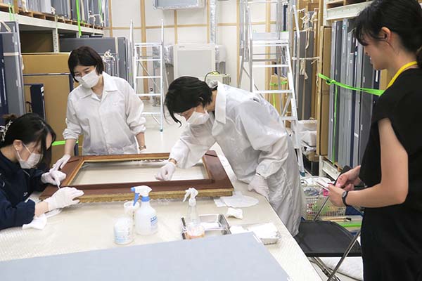 横浜市民ギャラリーの所蔵作品は制作から時間が経ったこともあり、修復を要するものが散見されます。そのため、修復の専門家による修復や、安全性を確認しながら職員もクリーニングを実施しています。今年度のインターン活動では、職員による額のクリーニング作業を見学しました。作品の保管と維持の大変さを、改めて実感する機会となりました。