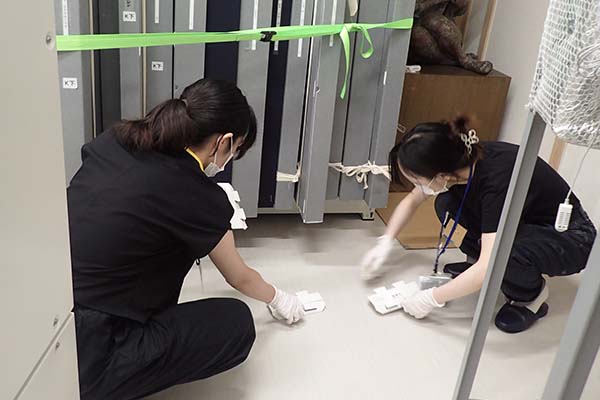 細かな手順を積み重ねて環境を点検していくプロセスに、インターン生は驚きを感じている様子でした。虫を捕獲するトラップの交換や、壁や床に付着したカビを採集する作業、収蔵庫の清掃など、さまざまな作業に興味深そうに取り組んでいました。